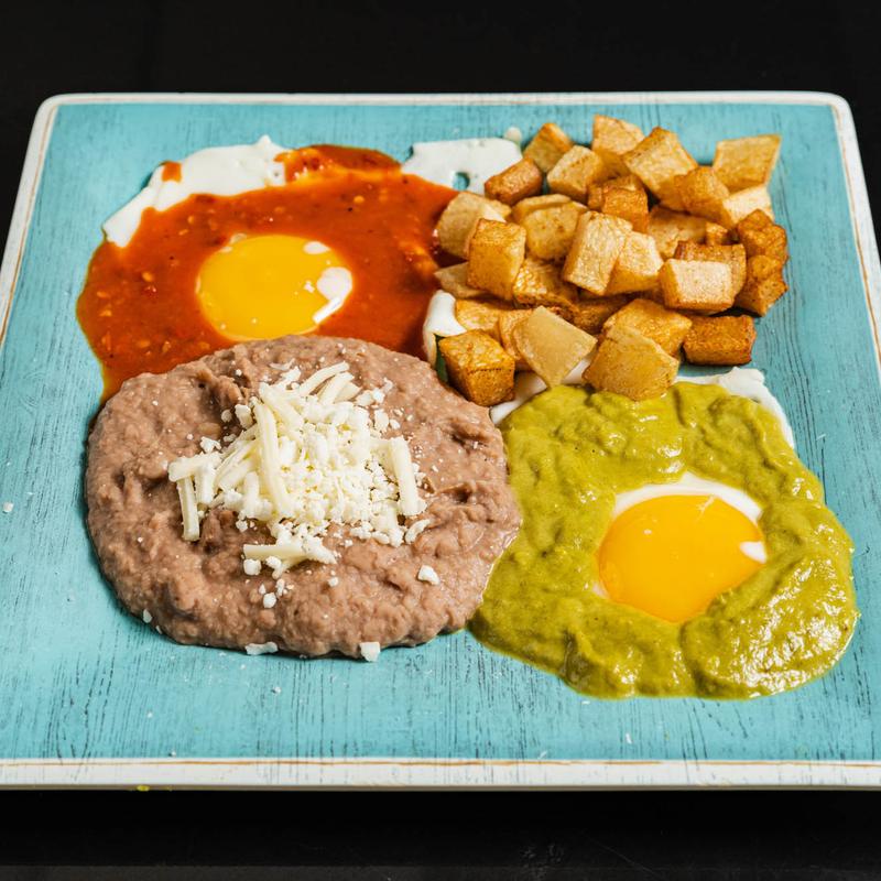 2 huevos estrellados con salsa verde y roja — frijoles fritos y papa de desayuno