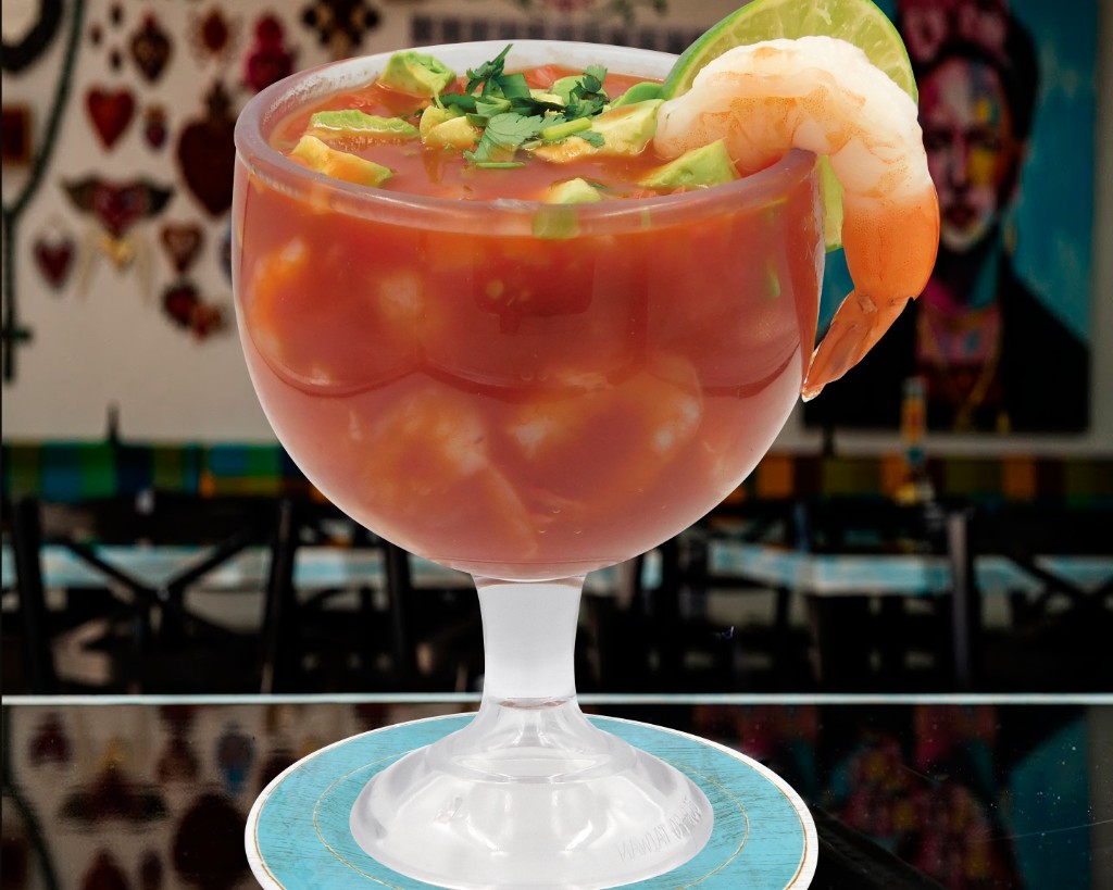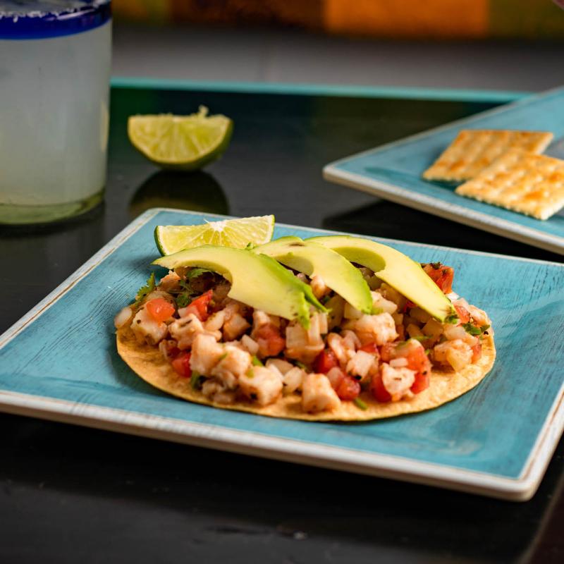 Cubos de pez dorado, jitomate, cebolla, cilantro y especias marinados en jugo de limón con aguacate