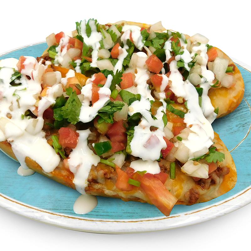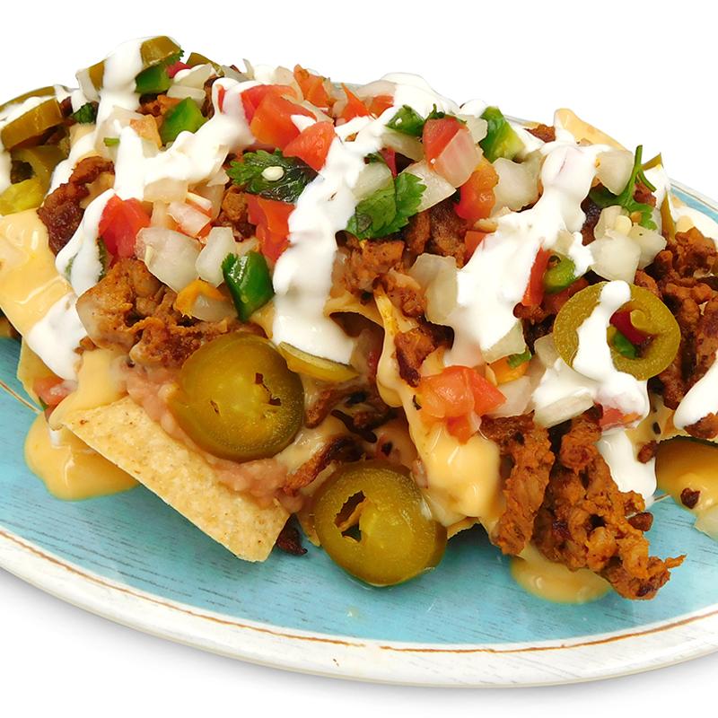 Totopos, frijoles fritos, queso amarillo, carne a elegir, pico de gallo y jalapeños · con crema y guacamole +3.25
