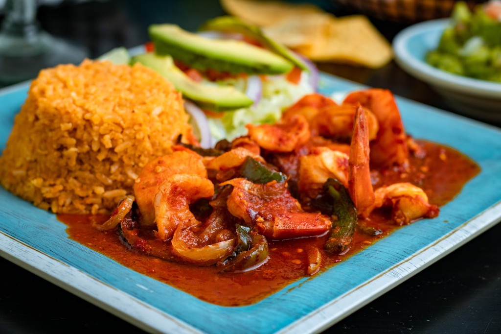 Pollo asado, fajita de res, sausage humado, camarones, cebolla y chile morrón — arroz, frijoles fritos, guacamole y tortillas de maíz o harina