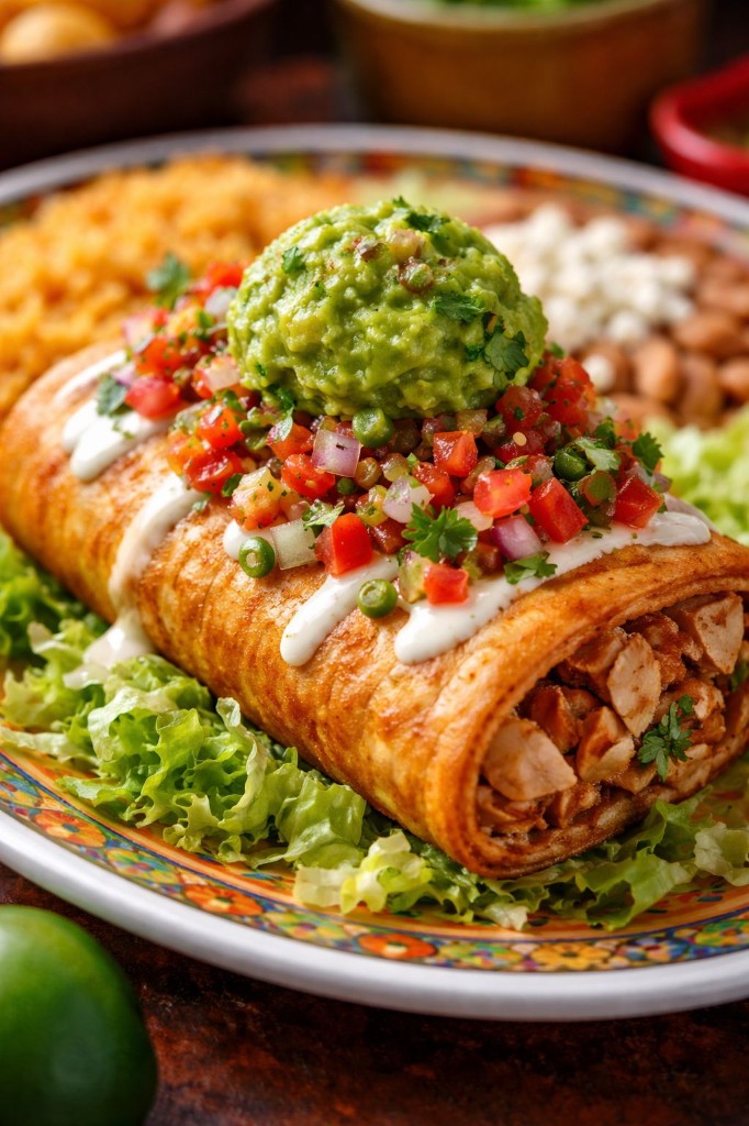 Servida con frijoles fritos, arroz, guacamole y pico de gallo — tortillas de maíz o harina