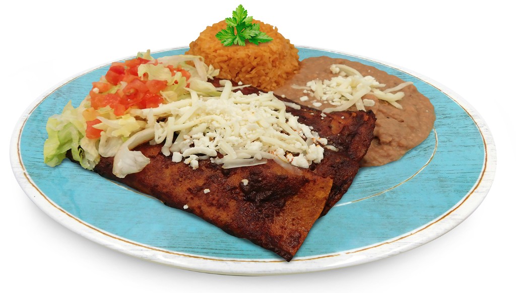 3 enchiladas rojas o verdes de pollo o queso (fresco y monterrey) con arroz y frijoles fritos · de mole poblano +2.99