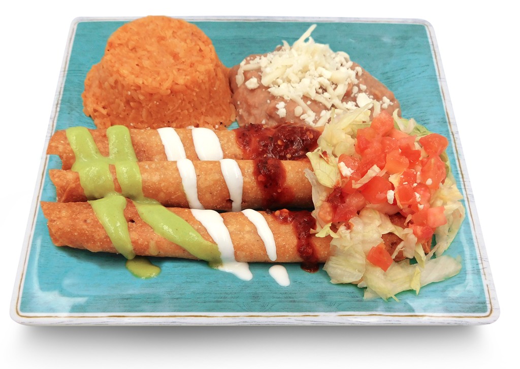 3 flautas de pollo, lechuga, queso, salsa roja y verde y crema — arroz y frijoles fritos