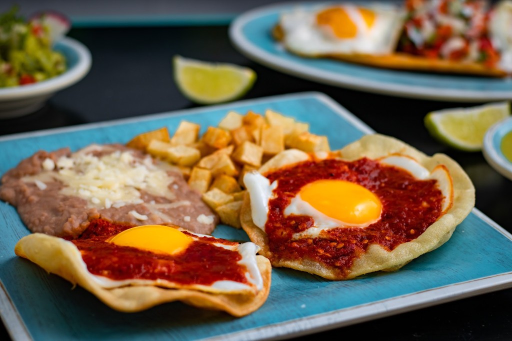 2 huevos estrellados sobre tortilla dorada y cubiertos en salsa roja — frijoles fritos y papa de desayuno