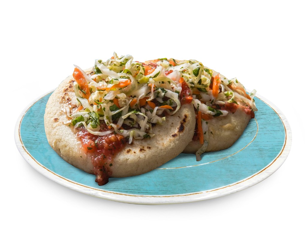 Frijol y queso, loroco y queso, y chicharrón y queso — con curtido y salsa