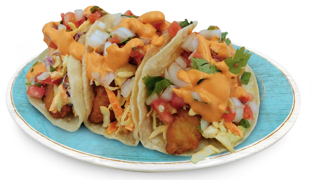 Filete de pescado empanizado con cerveza oscura, ensalada de col y aderezo de crema de chipotle y limón